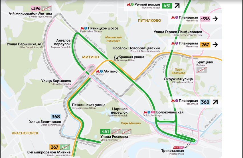 Те, кому нужно доехать до 8-го микрорайона Митина, смогут пользоваться маршрутом 267, который будет ходить от метро «Планерная» по прежнему маршруту. Чтобы попаcть в Волоцкой переулок, садитесь на автобус 368. А на улице Барышиха до станции метро «Митино» пользуйтесь маршрутом с396.